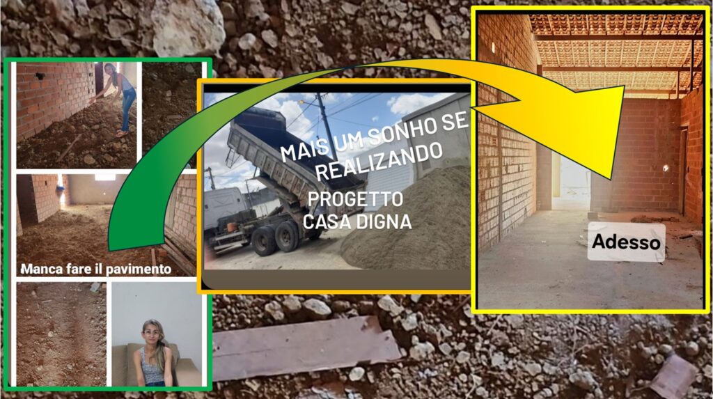 Obiettivo – Completamento dell’abitazione della Sig.ra Vanusa che vive con la figlia in una abitazione in affitto pagata dai volontari locali che operano insieme alla referente locale Isabel Santos Dantas. Parte della casa è stata già realizzata con il contributo volontario di alcune famiglie del posto. Mancano altri lavori da eseguire ma quello più importante è il pavimento della sua nuova abitazione che attualmente è in terra.